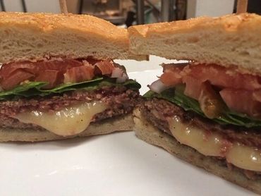 topped w/ lettuce, red onion, pickles & BOOM sauce on a bulkie roll